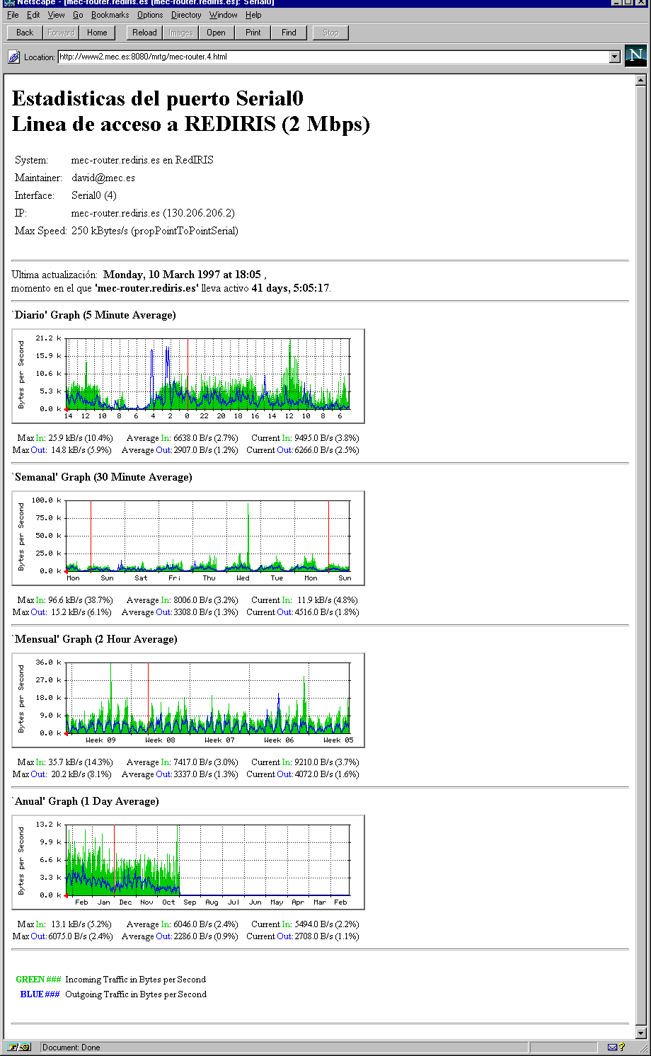 Target[mec-router.1]: 1:public@mec-router MaxBytes[mec-router.1]: 1250000 Title[mec-router.1]: mec-router.rediris.es (mec-router.mec.es): Ethernet0 PageTop[mec-router.1]: <H1>Estadisticas del puerto Ethernet0<BR> Red del MEC (MECNET)</H1> <TABLE> <TR><TD>System:</TD><TD>mec-router.rediris.es en RedIRIS </TD></TR> <TR><TD>Maintainer:</TD><TD>david@mec.es</TD></TR> <TR><TD>Interface:</TD><TD>Ethernet0 (1)</TD></TR> <TR><TD>IP:</TD><TD>mec-router.mec.es (193.147.0.1)</TD></TR> <TR><TD>Max Speed:</TD> <TD>1250.0 kBytes/s (ethernetCsmacd)</TD></TR> </TABLE>