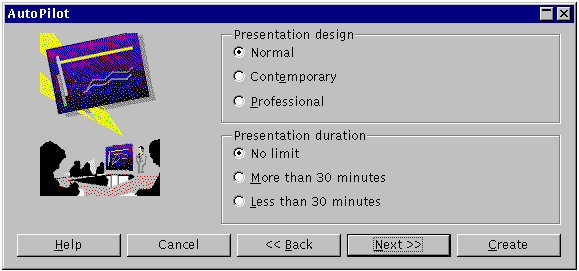 Er zijn twee manieren om een presentatie te maken: beginnen met een lege presentatie, of gebruik maken van de assistent --Auto Pilot (wizard)--. In het laatste geval, gebruik je File->New->Presentation, volg je de Auto Pilot vensters en op het eind heb je een set slide (dia) sjablonen voor je selectie (erg vergelijkbaar met MicroSoft's PowerPoint).