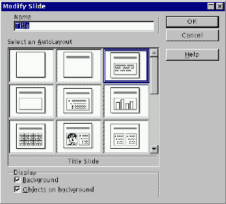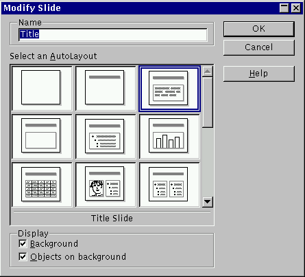 99% van alle slides die we maken zal een sterk vergelijkbaar aanzicht hebben: een titel en dan waarschijnlijk een lijst met tekst items. Deze taak komt veel voor en een eenvoudig mechanisme om ze uit te voeren zou dus handig zijn. Presentation staat ons toe om een slide structuur te kiezen uit een menu met mogelijke algemene structuren, waarbij iedere slide structuur op ieder moment kan worden aangepast.