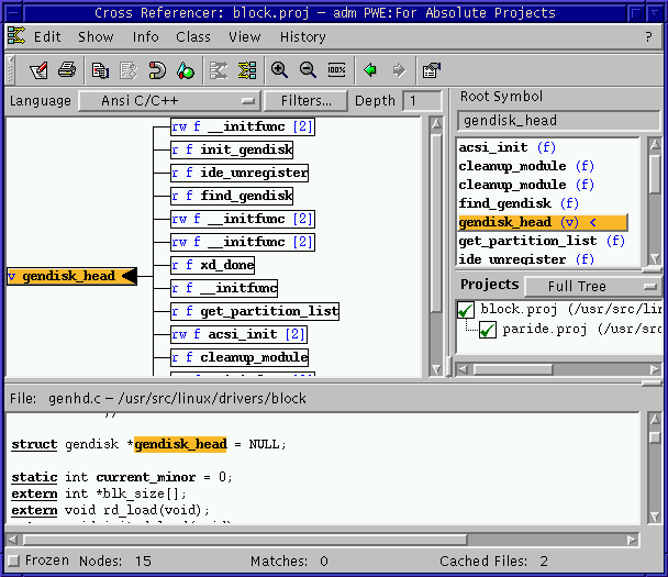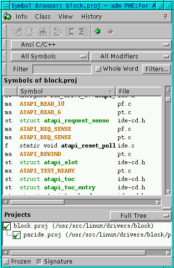 The symbol browser is similar to the project editor except that you see all symbols and where they are used. Via right mouse button click you can start the cross referencer (see below) and see where a symbol is referred to and which symbols refer to it. E.g which functions use this particular function or variable.