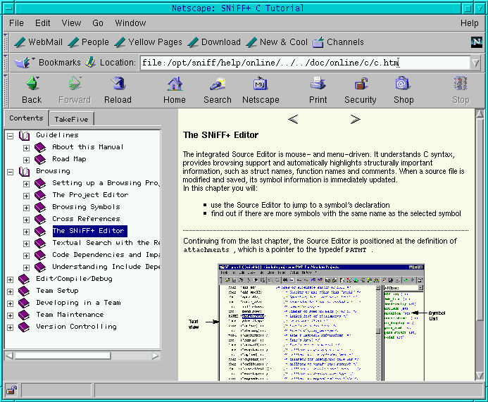 SNiFF+ comes with a very nice documentation system in html. There seems to be the possibility to print also the documentation from postscript files but I never felt that I needed this as the html documentation is good. When starting SNiFF+ with the command sniff you are first presented a welcome screen. This welcome screen gives you the possibility to go directly to programming language specific documentation. Selecting this item starts then netscape with the corresponding tutorial. I would recommend everyone to go at least quickly through the tutorial