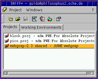 A project is the main structuring element in SNiFF+ for grouping together files and directories. When starting sniff you are presented with the following small launcher window. From here you create new projects and you have an overview over the already existing ones. Here you normally begin your work by starting the project editor or the symbol browser.