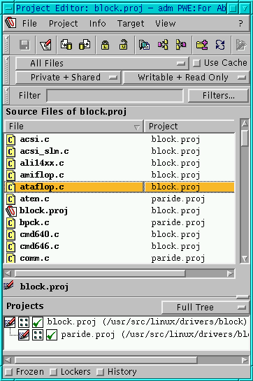 In the project editor you see all the source files belonging to a project. You can filter on that list, include/exclude sub-directories etc. It shows also version control/locking information and you can checkin/checkout files. A very nice feature is that you can search in the list of file names by just typing the file name. The search function is incremental, searching while typing, similar to emacs isearch.