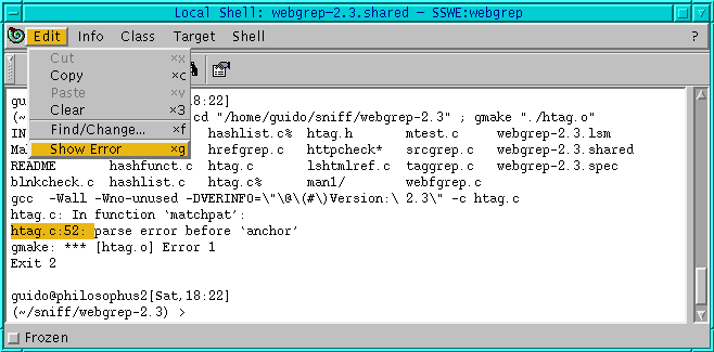 The shell window is mainly used during a compile run. You can see the error messages from the compiler in that window. To jump to an error in the source code you highlight the line of the error message in the shell and then you select Edit->Show Error. This takes you in the source editor to the line where the error happened. This shell window is otherwise very simple. See also further down for a description of problems that I had with this shell window.